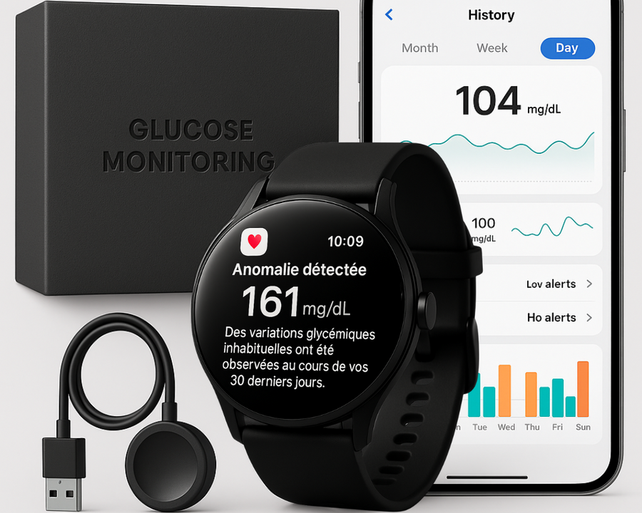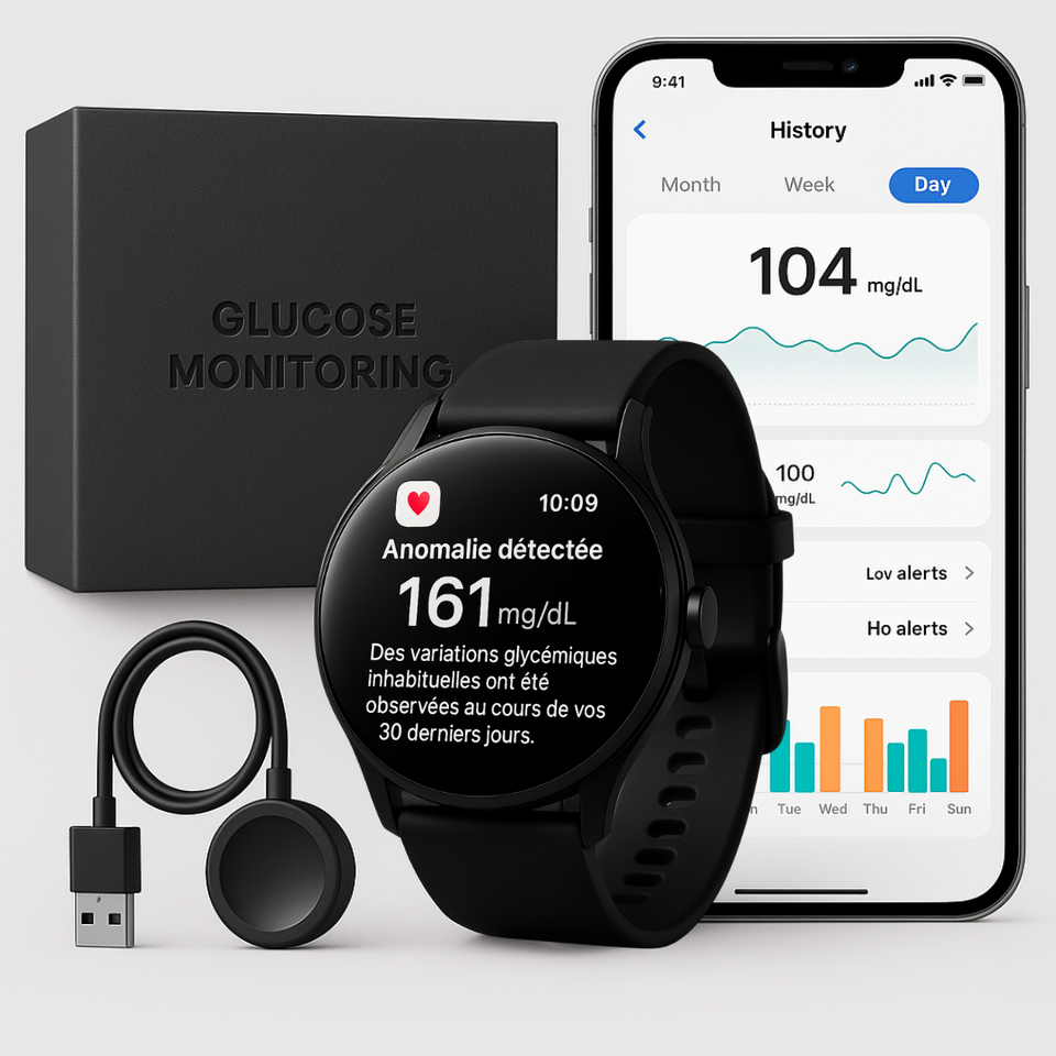 Quand il est question de glycémie, chaque donnée compte. Grâce à ses capteurs optiques infrarouges traversant la peau et à son algorithme intelligent, GlucoWatch™ analyse vos variations glycémiques jour et nuit. Vous recevez une alerte en cas d’anomalie et gardez une vue d’ensemble claire sur votre santé — sans jamais avoir à vous piquer.